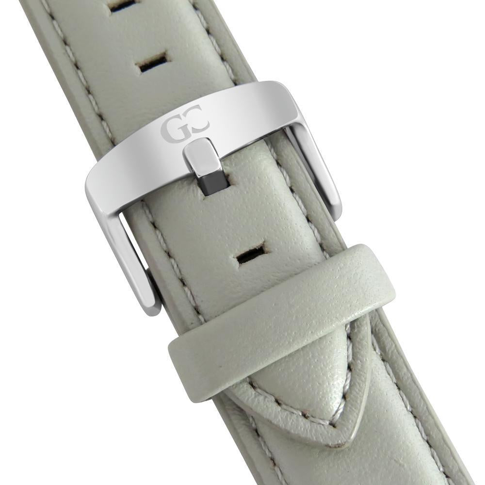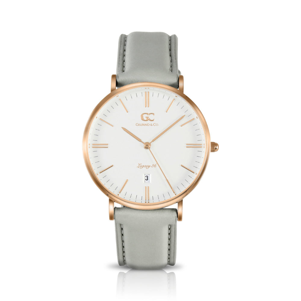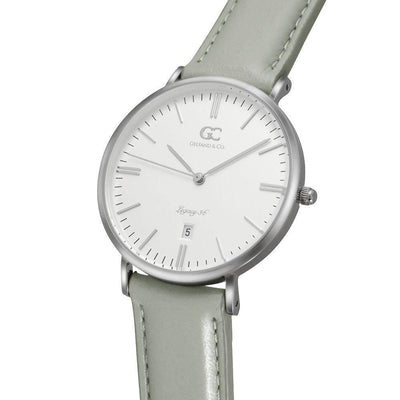 A casual light gray leather strap punctuates the cachet of the white sundial upon Chrystie. A classic push/pull crown provides proven analog accuracy to set the date, hour, and minute with practical finesse.