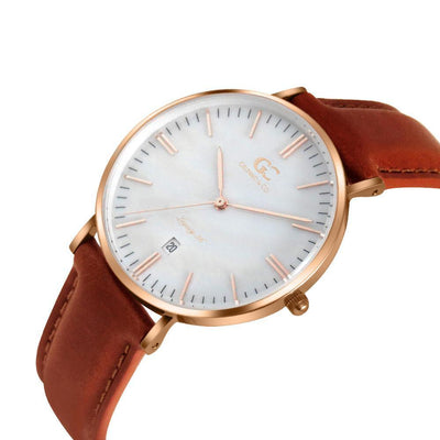 The genuine brown leather strap caresses the elegance of the pearl sundial of Trinity. A classic push/pull crown provides proven analog accuracy to set the date, hour, and minute with practical finesse.