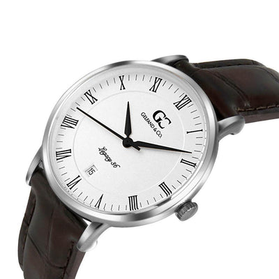 The luxurious Silver or Rose Gold accentuation upon Washington sophisticate the crocodile embossed brown leather strap. A classic push/pull crown provides proven analog accuracy to set the date, hour, and minute with practical finesse.